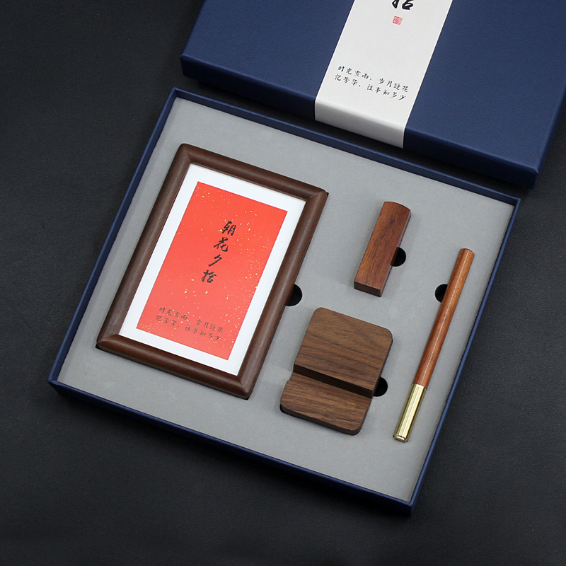 型号:T4-16 品名:朝花夕拾实木相框+方寸印章+手机支架+红木笔 包装:精美礼盒+手提袋 礼盒尺寸:280*250*35mm 产品材质:黄金檀木、黑胡桃、黑檀、酸枝、科檀 礼盒颜色:蓝色、红色 零售价:158元