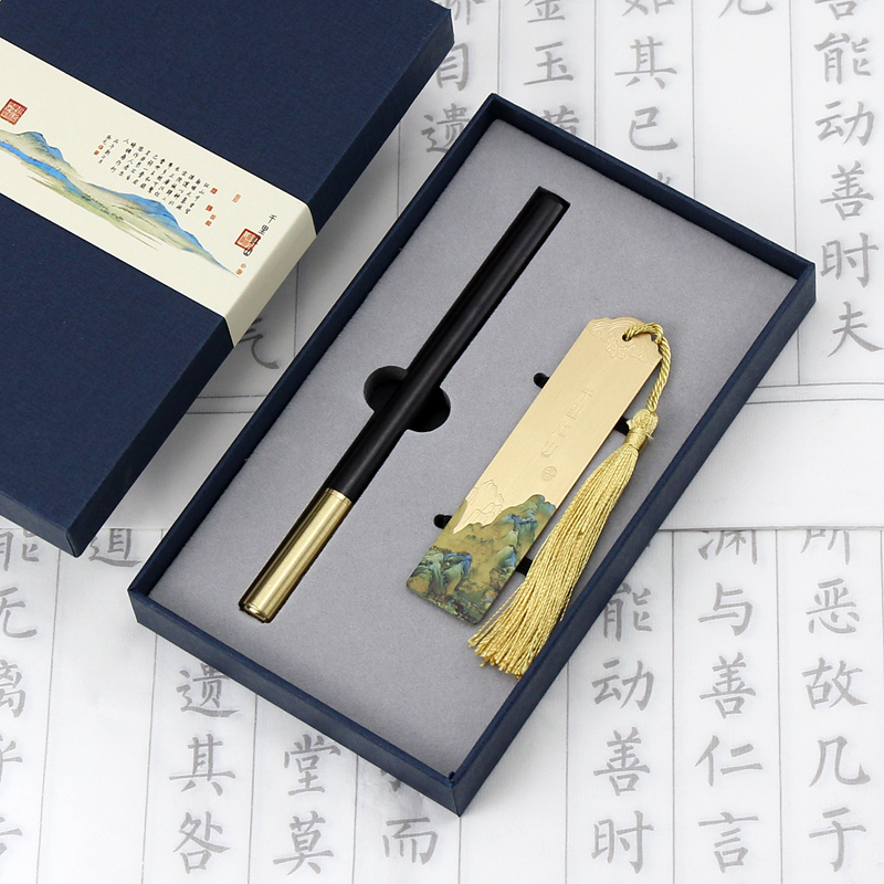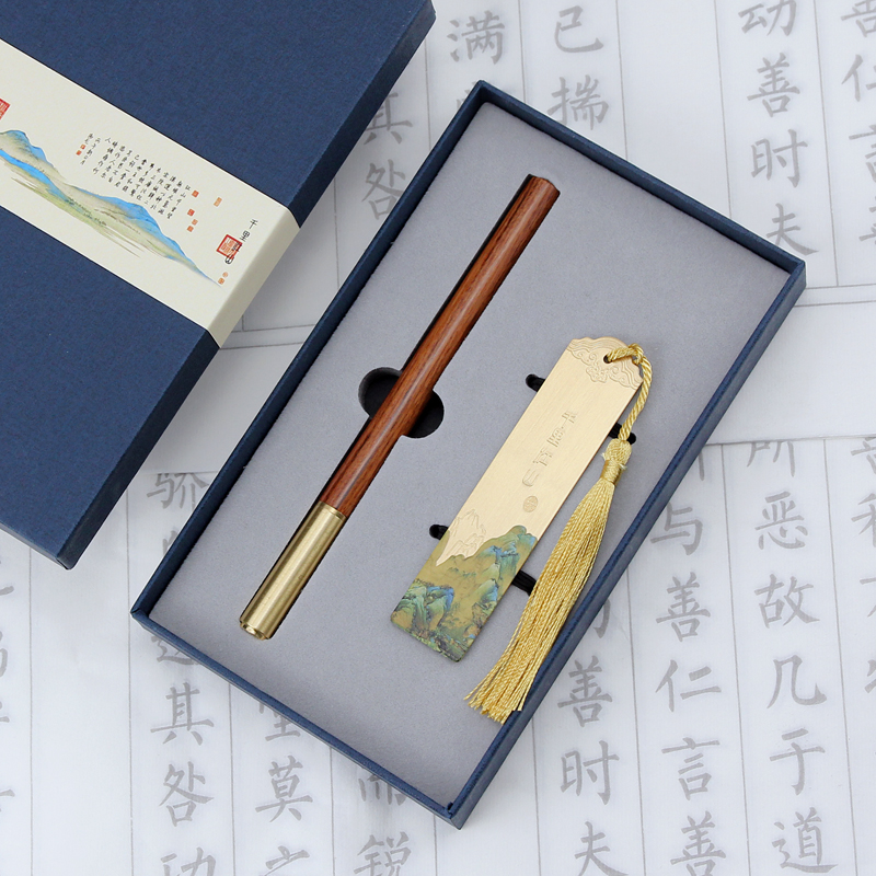 型号:T2-03-7 品名:红木笔+千里江山书签(小号) 包装:配礼盒(无手提袋) 材质:红木+黄铜(加厚至0.9mm) 书签尺寸:100*23mm 礼盒尺寸:185*110mm 礼盒颜色:标配深蓝色 零售价:35元