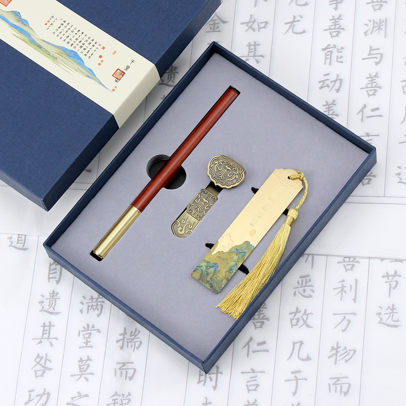 型号:T2-04-7 品名:红木笔+如意U盘+江山书签(小号) 包装:配礼盒+手提袋 材质:红木+黄铜(加厚至0.9mm) 书签尺寸:100*23mm 礼盒尺寸:190*143*25mm 礼盒颜色:标配深蓝色 零售价:78元