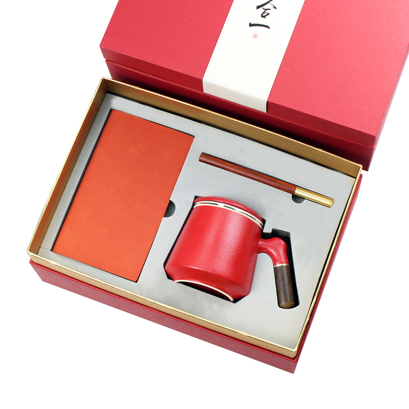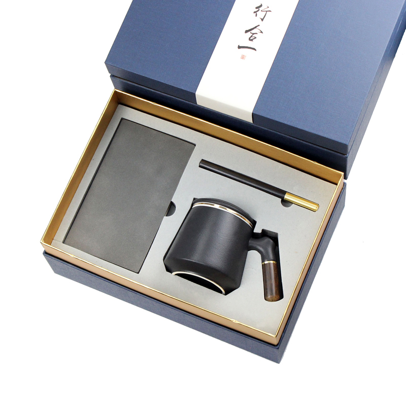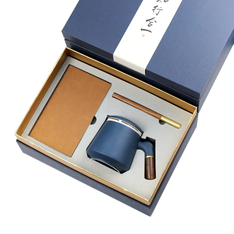 型号:T5-05-1(陶瓷茶漏杯) 配置: A6羊巴本+笔+陶瓷杯 颜色:蓝、黑、红 礼盒:300*215*120mm 箱规:63*46*57cm 装箱数:16套 包装:配礼盒、手提袋 礼盒颜色:深蓝色、红色 零售价:148元