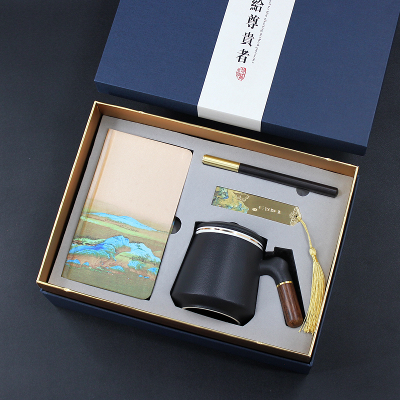 型号:T5-08-2(陶瓷茶漏杯) 配置: 江山丝绸本+笔+书签+陶瓷杯 颜色:蓝、黑、红 规格:350ml茶杯 礼盒:300*215*120mm 箱规:63*46*57cm 装箱数:16套 包装:配礼盒、手提袋 礼盒颜色:深蓝色、红色 零售价:148元