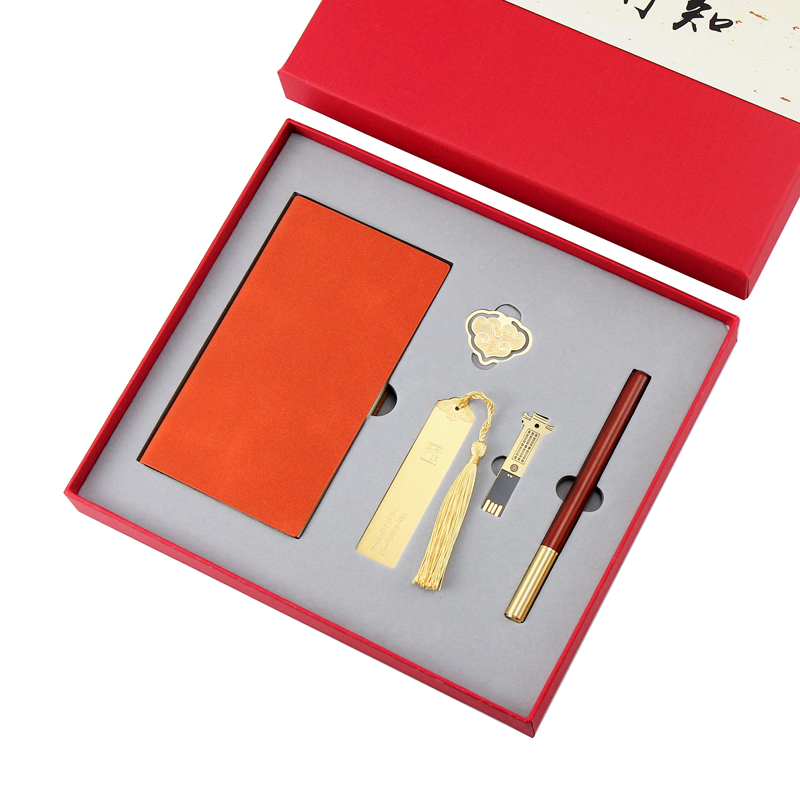 型号:T4-04 品名:耕读5件套 配置: 羊巴A6本+书扣+书签+U盘+匠心笔 颜色:棕、黑、红 礼盒尺寸:280*250*35mm 箱规:59*52*35cm 装箱数:36套 包装:配礼盒、手提袋 礼盒颜色:深蓝色/红 零售价:98元