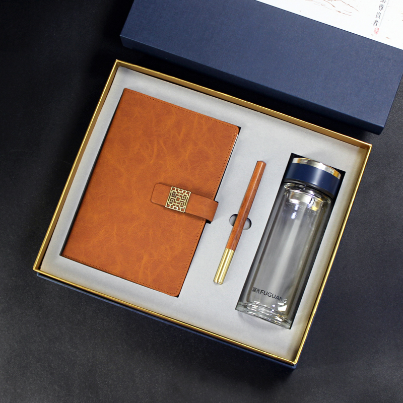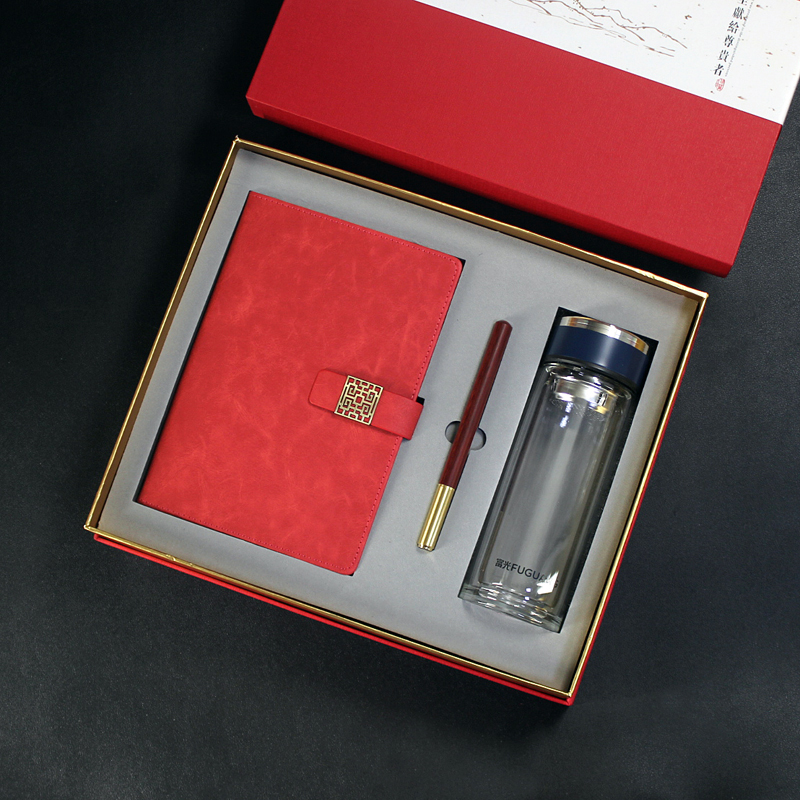 型号:T6-04-3(富光玻璃杯) 配置: 富光玻璃杯+笔+A5窗花搭扣本 颜色:棕、黑、蓝、红 规格:笔记本:215*145mm 笔:148*12mm 礼盒:320*270*80mm 箱规:57*34*56cm 装箱数:12套 包装:配礼盒、手提袋 礼盒颜色:深蓝色/红色 零售价:178元