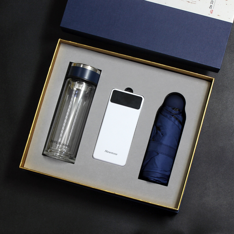 型号:T6-10-3(富光玻璃杯) 配置: 富光玻璃杯+纽曼电源+晴雨伞 颜色:黑、红 规格:充电宝:146*67mm 保温杯:195*65mm 礼盒:320*270*80mm 箱规:57*34*56cm 装箱数:12套 包装:配礼盒、手提袋 礼盒颜色:深蓝色/红色 零售价:268元